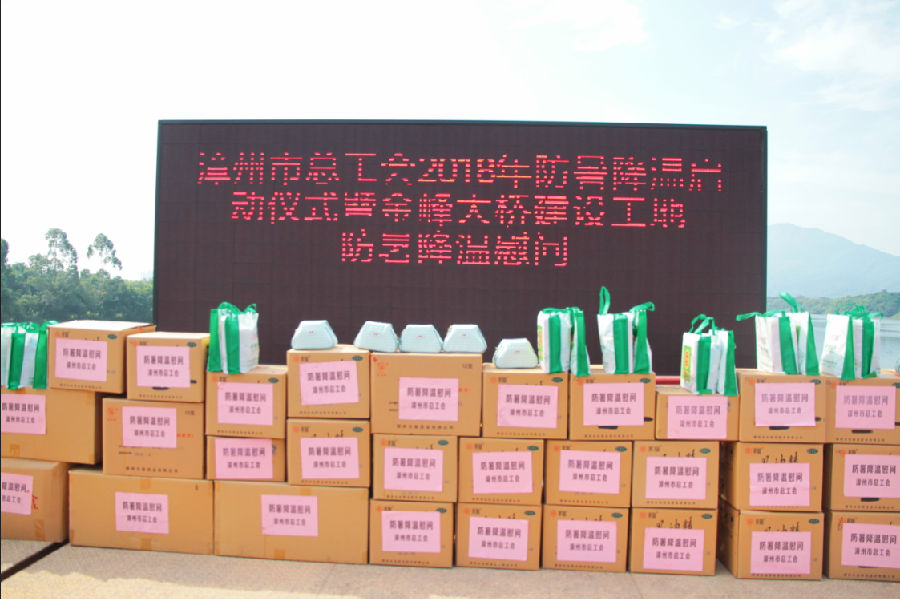 6月29日上午,漳州市总工会在金峰大桥建设施工现场举行2018年防暑降温启动仪式暨金峰大桥建设工地慰问活动。市委常委、秘书长、市总工会主席张琳光及相关部门领导参加了此次慰问,我公司产品水仙清凉包被选为此次防暑降温慰问用品,亮相慰问现场。市委领导为坚守在一线的建设者送上水仙清凉包,并向他们表示诚挚的慰问和衷心的感谢。